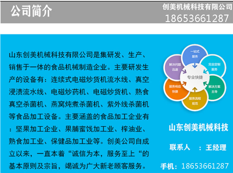 炒貨機(jī)流水線可以根據(jù)客戶產(chǎn)品數(shù)量的要求來加工訂做,具體請咨詢客服