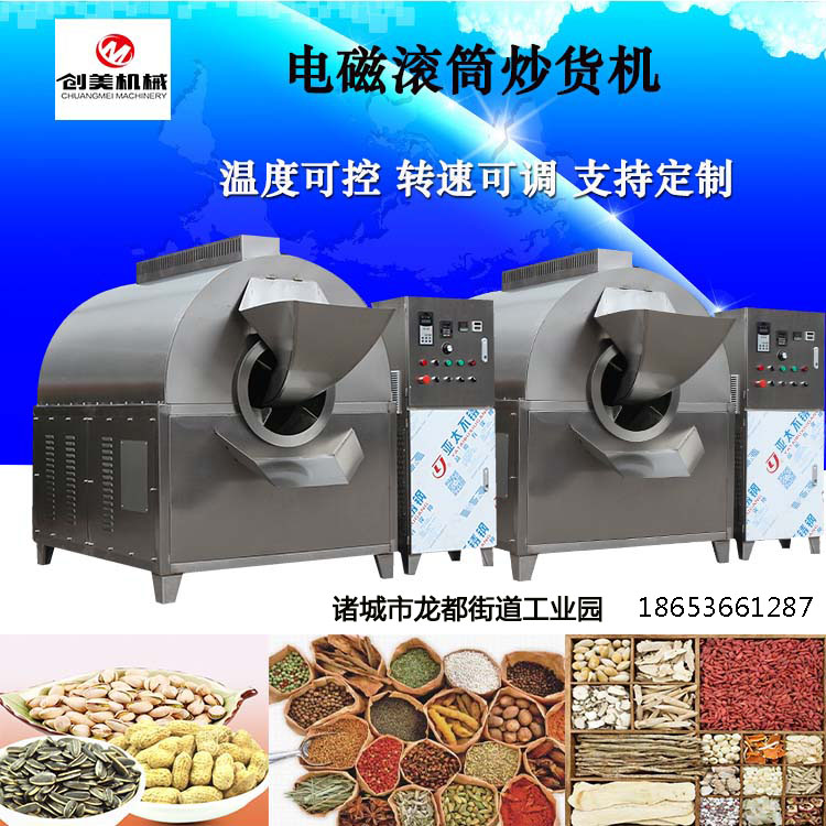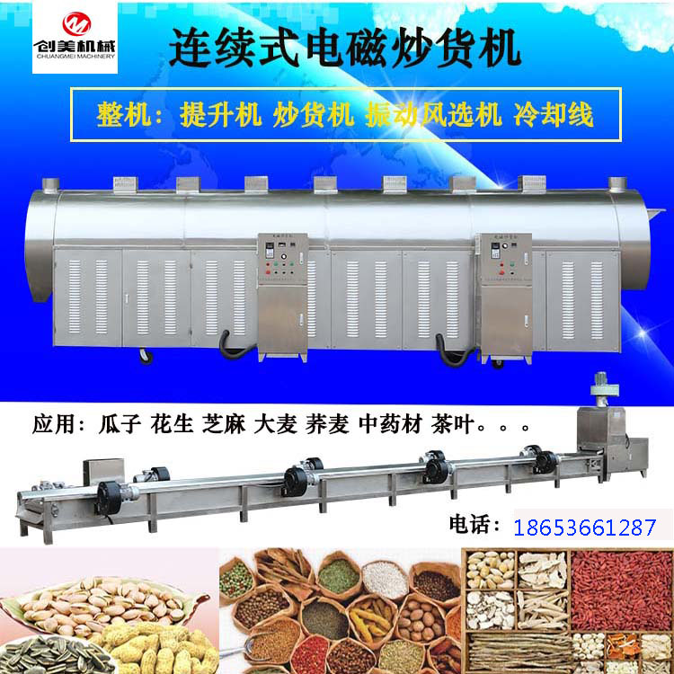 電磁炒貨機分為電磁炒機單機與連續式流水線產量從50斤到1500斤都可以炒制,電磁加熱控溫控時具體詳細